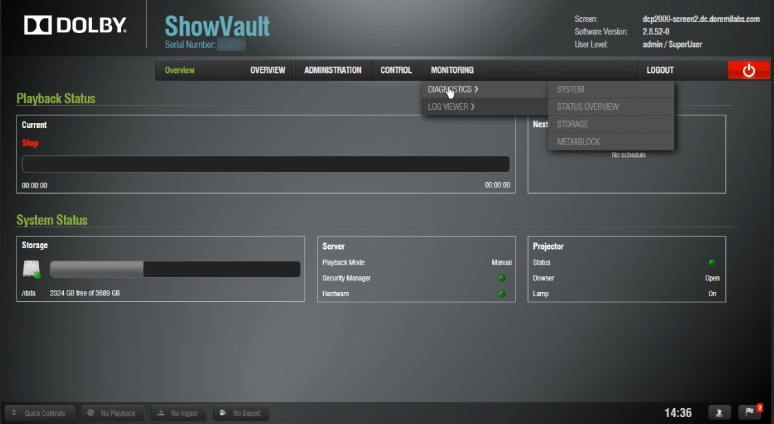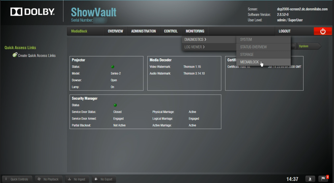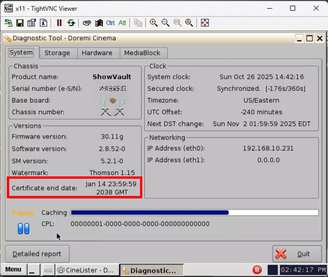 The original security certificate expiration date for Doremi ShowVault, DCP-2000 or DCP-2K4 servers was set to expire on November 30, 2025. Once expired, the server will no longer be able to play secure content. Dolby issued a technical bulletin in 2023 advising owners of this matter, along with another issue that prevented the servers from recognizing dates on or after January 1, 2024. Most users updated their security certificates at the same time that they updated the software to recognize dates after 2023. These updates were outlined in the Dolby bulletin linked below:
